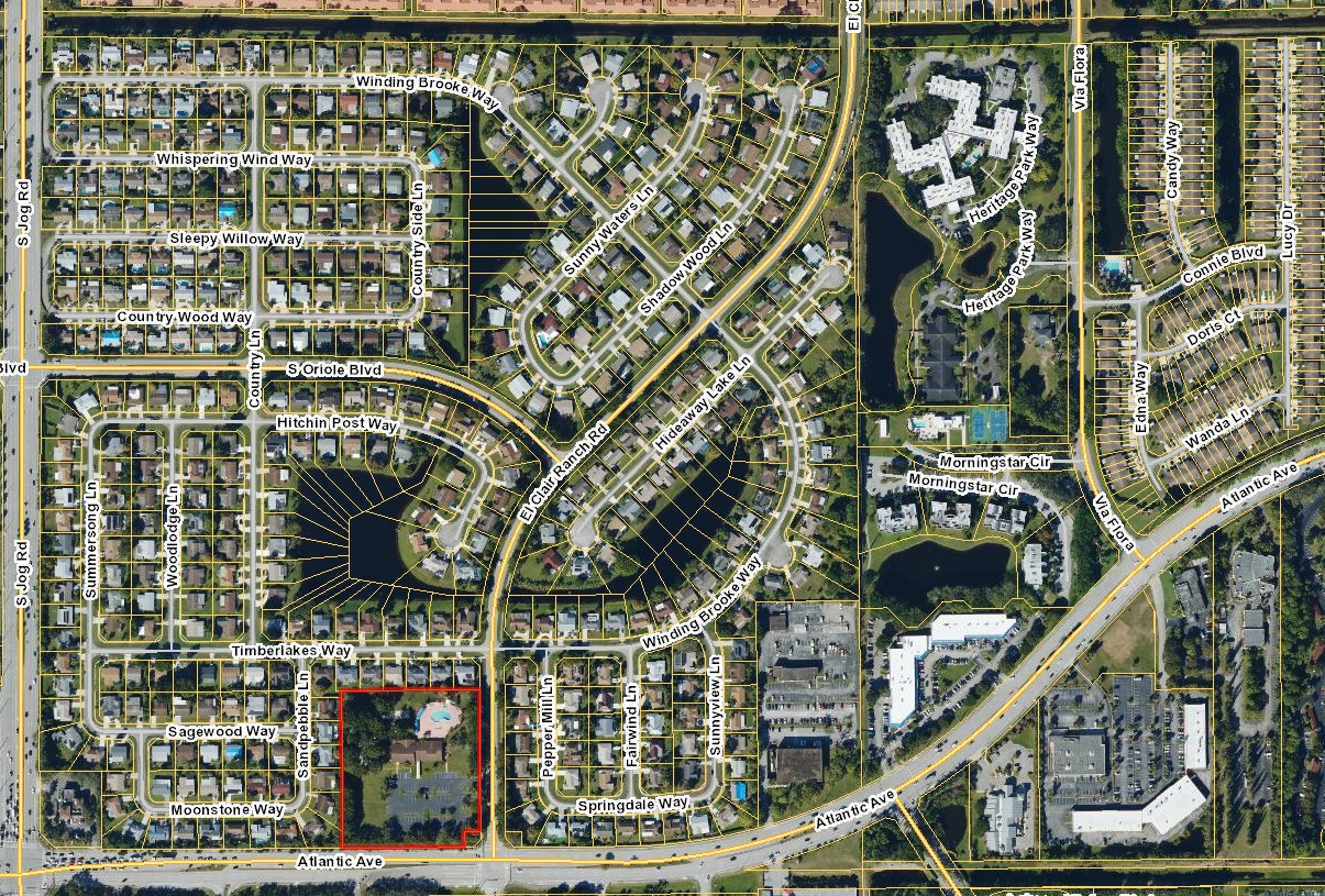 This screenshot from the Palm Beach County GIS Ownership Records viewer shows parcel boundaries (yellow). The clubhouse is a separate parcel highlighted in red. Around the nearby lake, the parcel lines radiate into/through the waterbody in wedge-shaped segments, reflecting an older/private-lot parceling pattern rather than a single “common area” lake tract. In many newer subdivisions, stormwater lakes/ponds are instead platted as dedicated water management tracts/common areas with required maintenance access easements, and post-construction maintenance responsibility typically shifts to the HOA (or a contracted manager).2  3 4